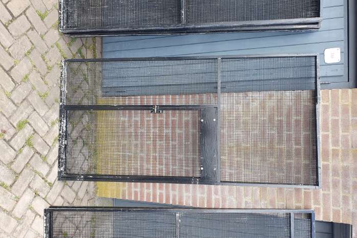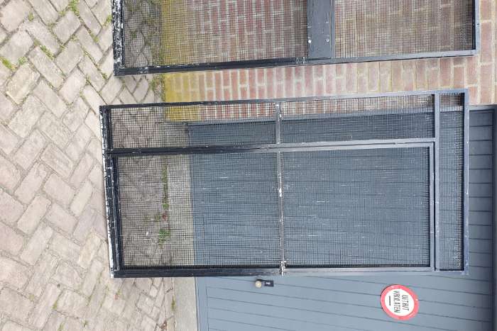 Nette gaas panelen. 6 x 100 x 200 Panelen met kleine deur 2 x 100 x 200 Panelen met grote deur 2 x 100 x 200 Gaas 12, 4 x 12, 4 Muizen proef Zwart geverfd. Samen 200 ,00 eur vaste prijs Bij interesse graag bellen 0651389513