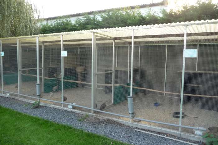 5 panelen alu 500X200 cm - 5 panelen alu 500x190cm - 9 tussenpanelen alu 300 cm lang met hoogte 200>190 cm, met deuren ( 8 stuks - 90cm breed ) - draad is in galvanisé in goede conditie - houten liggers 300x6x7 cm voor dakstructuur - rol polyester golfplaat 25 meter X 320 cm ( dakbedekking), inclusief dakgoten, haken, zitstokken en voedersilo's